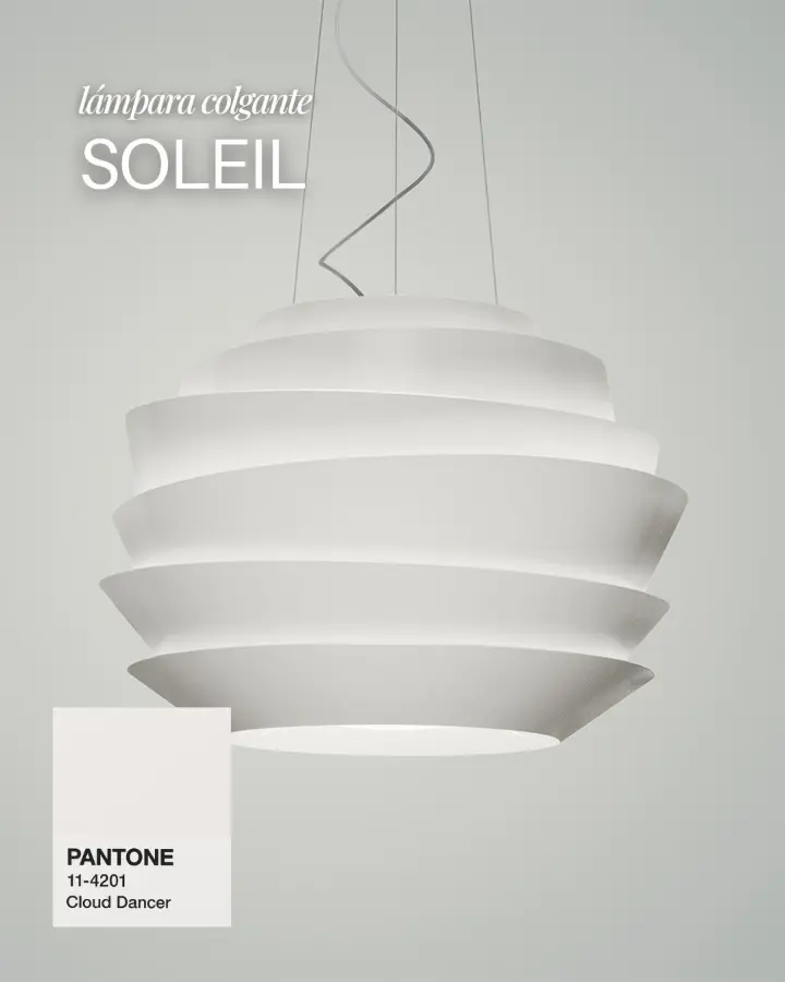 Diseñada por Giuseppe Maurizio Scutellà, la Pirce es un ícono de Artemide que parece esculpida por el viento. Su estructura de discos de aluminio que se abren en espiral crea un juego de luz indirecta único. En un entorno Cloud Dancer, la Pirce no solo ilumina, sino que define el volumen del espacio, aportando esa sensación de fluidez y calma que define al 2026.